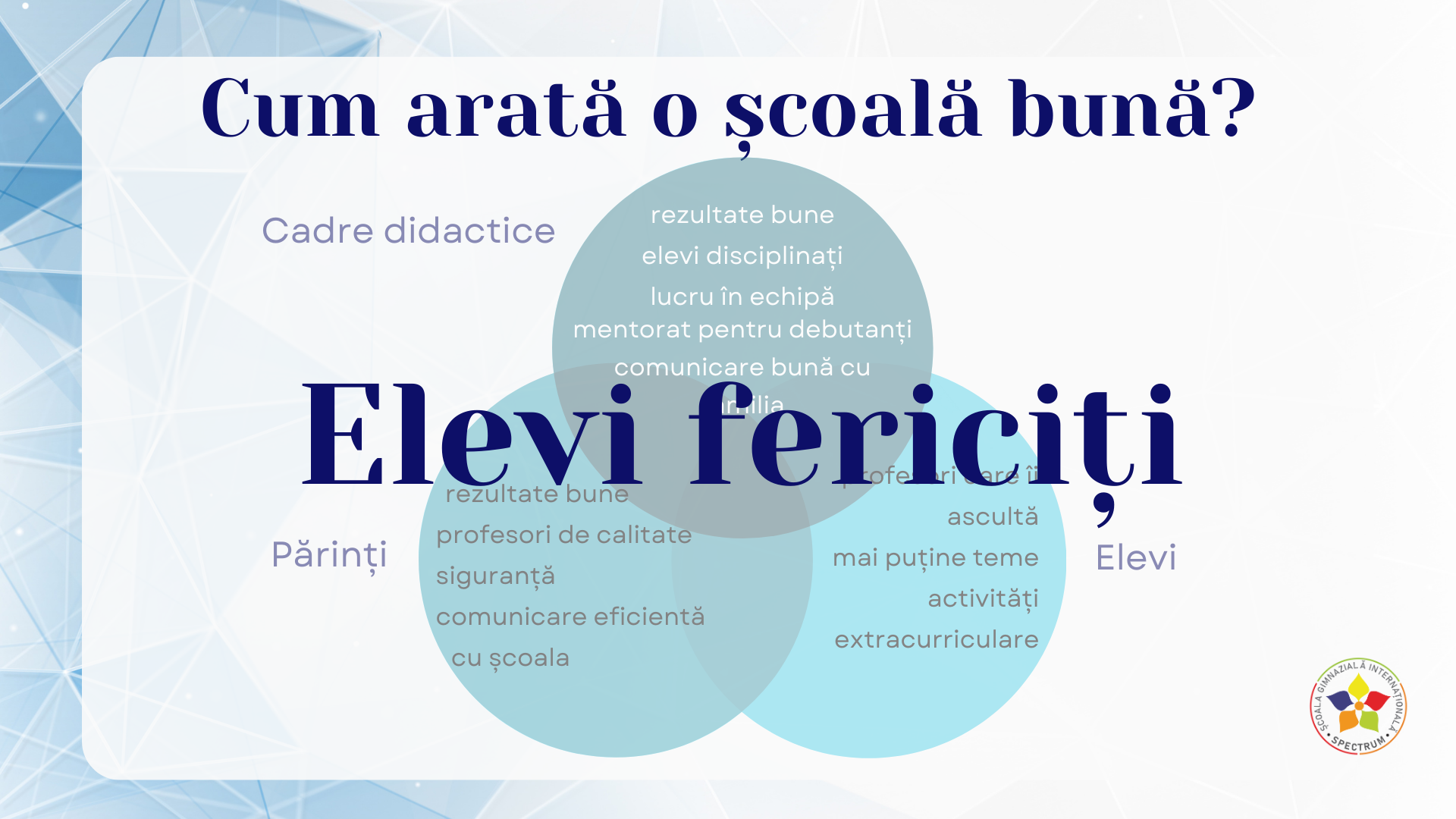 Întrebarea majoră pe care mi-o pun zilnic și cu care mi-am și început prezentarea a fost și întrebarea la care am căutat răspunsul în cele două zile ale conferinței. Pentru a răspunde la întrebarea „Cum arată o școală bună?”, sunt extrem de mulți factori de luat în considerare, iar, deseori, ceea ce vedem la sfârșitul zilei este doar „vârful iceberg-ului”. Urmărind discursurile trainerilor despre școală ca organizație mi s-a confirmat din nou importanța unei echipe puternice și a legăturilor dintre angajații școlii. Așa cum într-o clasă ne străduim să încurajăm colaborarea, și în mediul în care lucrăm ar trebui să punem mai mult accent pe acest aspect. Colaborarea, siguranța psihică, timpul de reflecție, cursurile și lucrul în echipă sunt doar o parte dintre factorii la care trebuie să lucreze școala ca organizație, pentru a deveni „mai bună”.