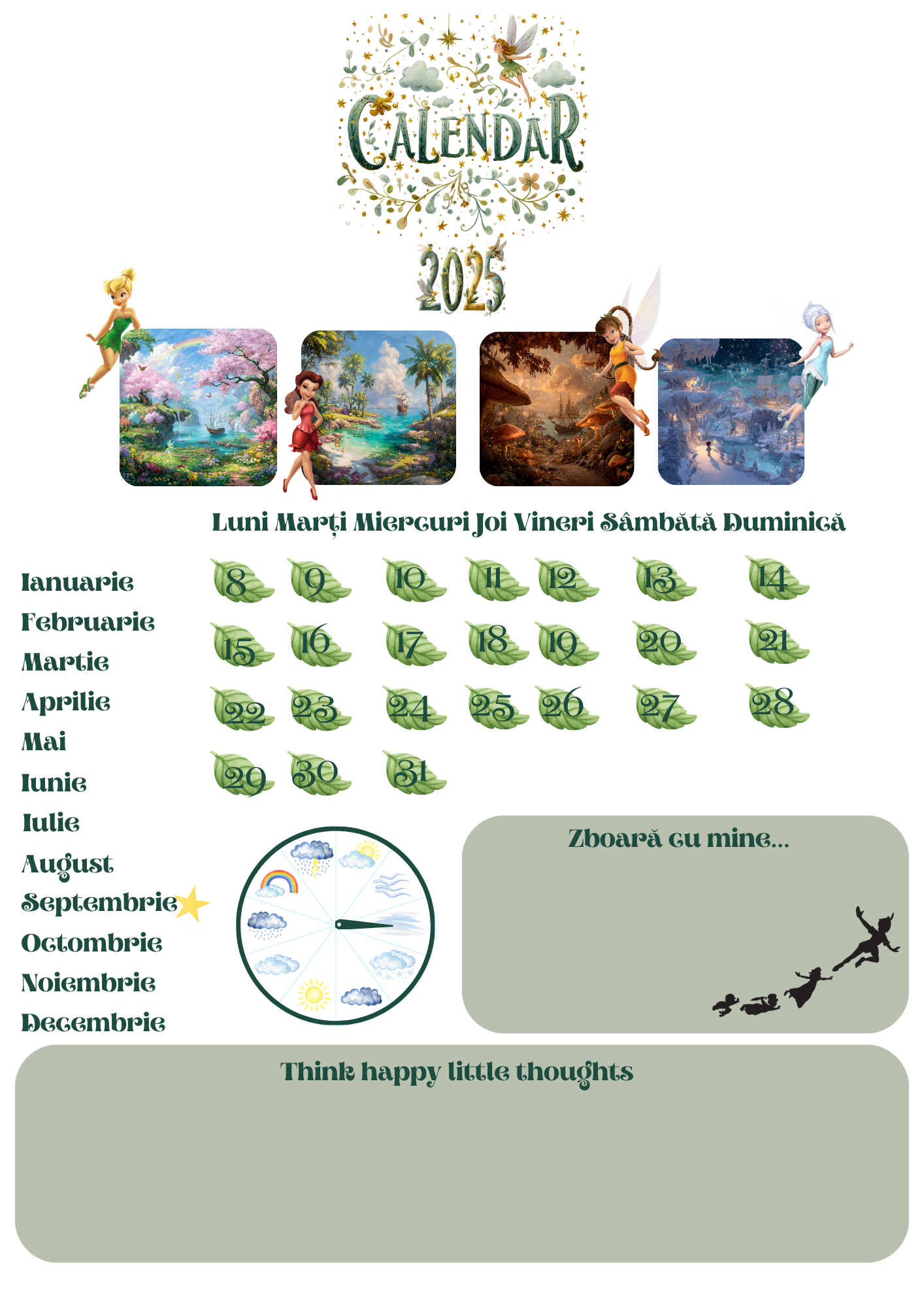 Calendarul îi ajută pe copii să descopere magia fiecărei zile prin joc și observație. Cu design pastelat și elemente inspirate din Peter Pan, calendarul transformă învățarea despre vreme, anotimpuri și timp într-o aventură plină de imaginație.